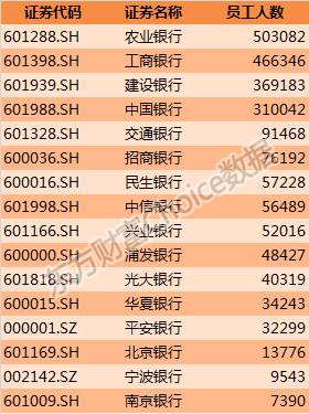 银行是金融行业的一大巨头,根据上市公司2015年年报数据,农业银行从业人员最多超过50万,另外三大国有银行从业人员通通超过30万。交通银行、招商银行、民生银行、中信银行、兴业银行的员工人数在5万到10万之间。上市银行中,宁波银行和南京银行的员工人数不足1万人。