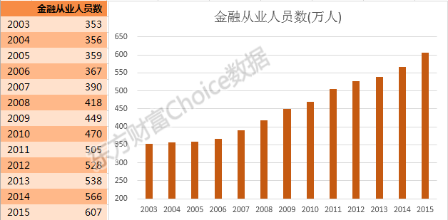 根据国家统计局的数据,2015年全国共有金融从业人数607万人,十年来增加了200多万,平均每年增加20万。