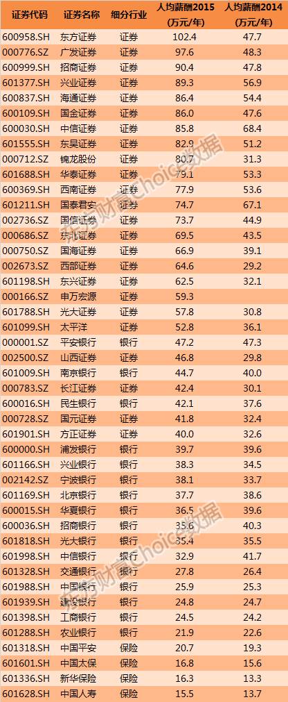 金融行业的高工资,体现在上市公司身上特别明显,这都是公开披露的数据,2015年股市大行情中,证券业人士可谓赚翻了天,东方证券平均年薪过了100万,另外还有广发证券、招商证券、兴业证券等19家证券公司人均年薪超过50万,当然证券业薪酬与市场行情的关系就特别的紧密了,三年不开张,开张吃三年。