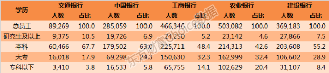 五大行的学历分配上,交通银行的平均学历水平较高,研究生以上学历的员工占比超过10%,本科占比67.7%,大专及以下学历占比为20%左右,中国银行的本科及以上学历占比为70%,建设银行本科及以上学历占比近6成,工商银行本科以上和以下学历各占一半,农业银行大专及以下学历的人员占比略高于本科及以上学历人员。