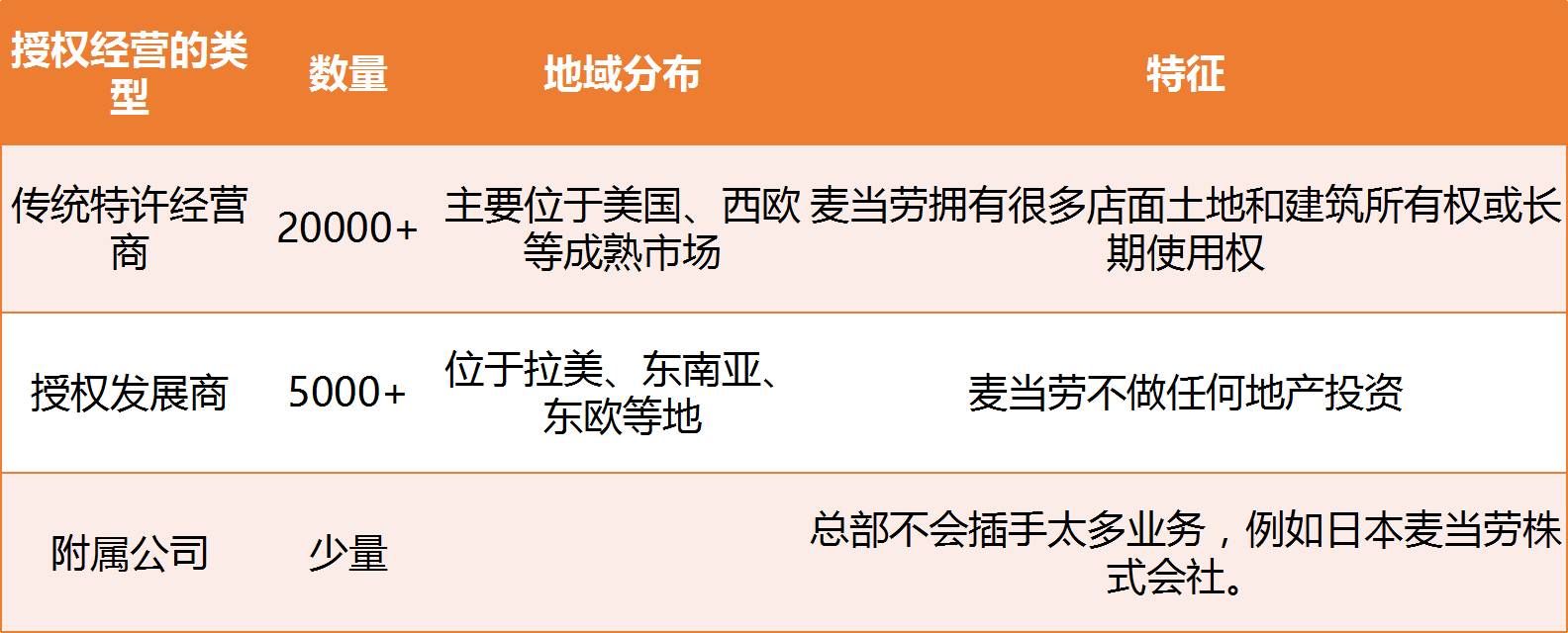麦当劳各地的经营模式不同。37000家店中,约80%是授权经营(如下图),而在麦当劳总部美国,这个比例更是高达 90%。
