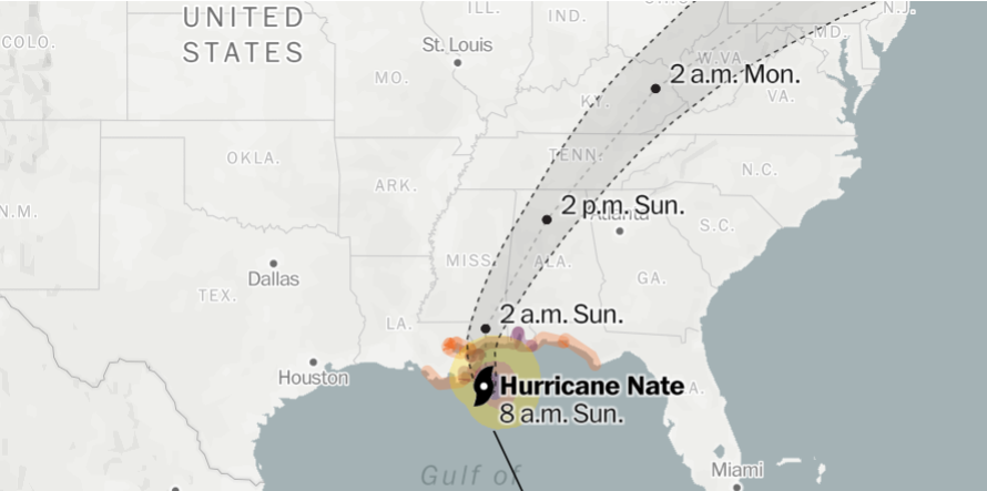 飓风“纳特”带来了强暴雨、大风和龙卷风等恶劣天气。路易斯安纳州、密西西比州、亚拉巴马州和佛罗里达州政府已经宣布其境内的数十个县进入紧急状态,部分地区已经命令民众撤离,并发布了宵禁令。