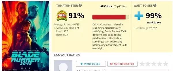而电影上映后,也获得多数影评极高的评价,其中大家最为盛赞的,除了《银翼杀手》系列氛围的重现,还有导演丹尼斯·维伦纽瓦的执导功力以及摄影师罗杰·狄金斯的视觉美学呈现。