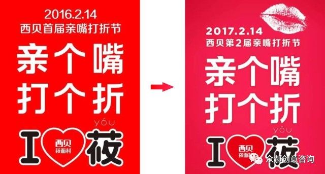 第一次的广告打出的是“首届”亲嘴打折节,今年自然就是“第二届”。这样久而久之,就会让消费者养成习惯,不用看西贝的广告,大家到了那一天就知道西贝肯定会搞这个活动而前去消费。