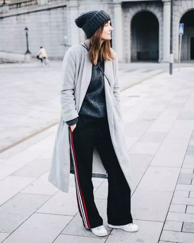 阔腿运动裤从去年一直流行到现在,不要以为只适合T恤,针织衫也同样可以搭。