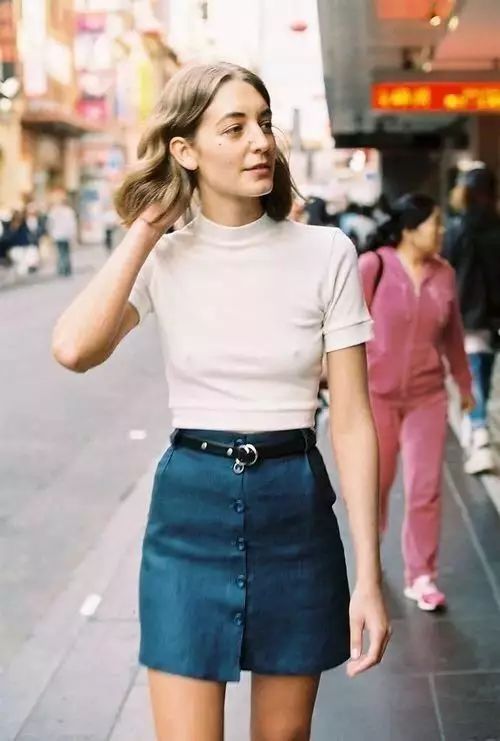 最简单的就是一件白色针织短袖,配上高腰牛仔裙。本身针织衫就比较贴身,上身瘦下身胖的梨形身材女生,这样的搭配最合适不过了。腰线露出来,少女感十足。