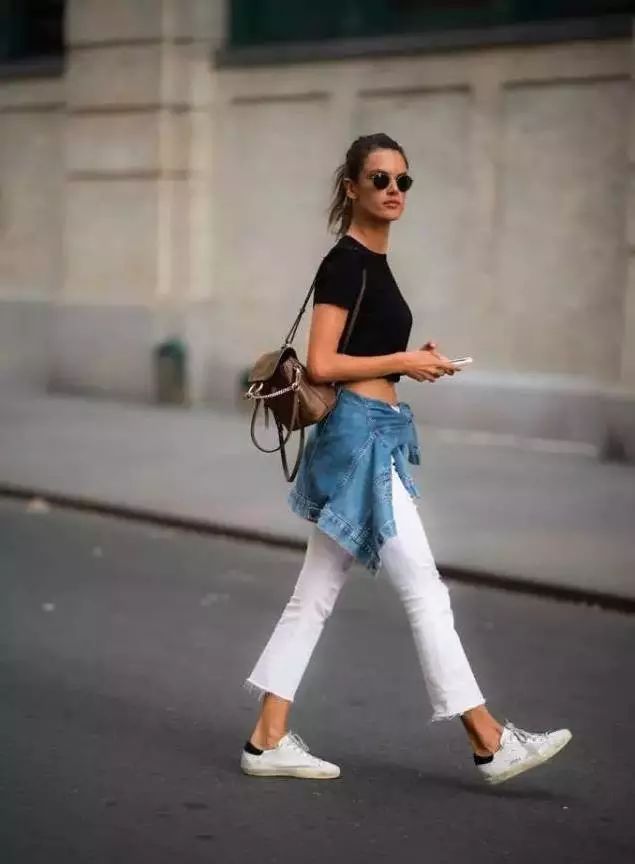 如果你觉得纯色针织衫有些无聊,选一件露腰的,有那么点小性感。再把牛仔外套、花衬衫系在腰间,既能很好的拗造型,晚上又能御寒。