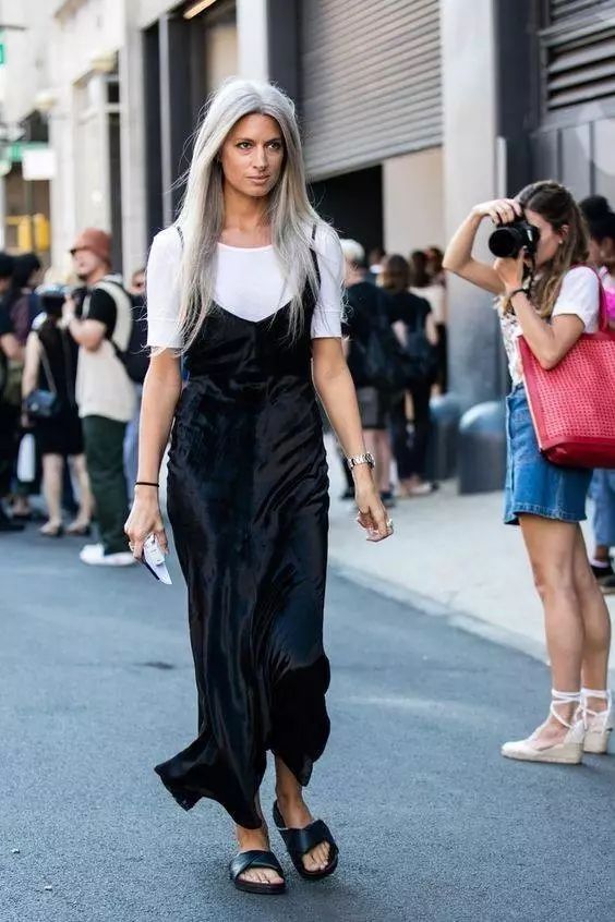 丝绒材质的slip dress和针织衫也很搭,经典配经典。
