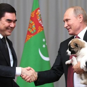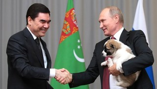当天,普京在黑海海滨城市索契会见到访的土库曼斯坦总统库尔班古力·别尔德穆哈梅多夫。美联社报道,正式会谈开始前,别尔德穆哈梅多夫把这只可爱的幼犬从笼子里拿出。他说:“我们有着共同的朋友,这是世界上独一无二的(顶级品种)中亚牧羊犬。今天,我将它带来(送给你)。”