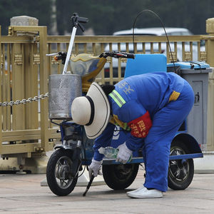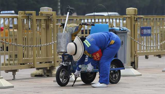 “前面的疏导员动作快点,后面的水车慢点,别溅到游客身上了。”环卫集团北京机扫公司副总经理刘家龙,站在金水桥的西侧便道上指挥作业人员。不远处,两辆中型洒水车正排成纵队匀速移动,车后呈扇面喷洒着清洗液。等洒水车把地面洒满泡沫后,两辆小巧的“山猫”多功能车开始磨洗作业。虽然模样呆萌、个头比越野车还小,但“山猫”机动灵活,车前的大滚筒,以每分钟1500转的速率摩擦着地面。司机戴昊明时不时地侧耳听声,“磨洗速率要控制好,得靠听滚筒的声音,‘唰唰’的最好。”他说,“山猫”的效率比人工作业至少高四倍,而且清洗效果更好。