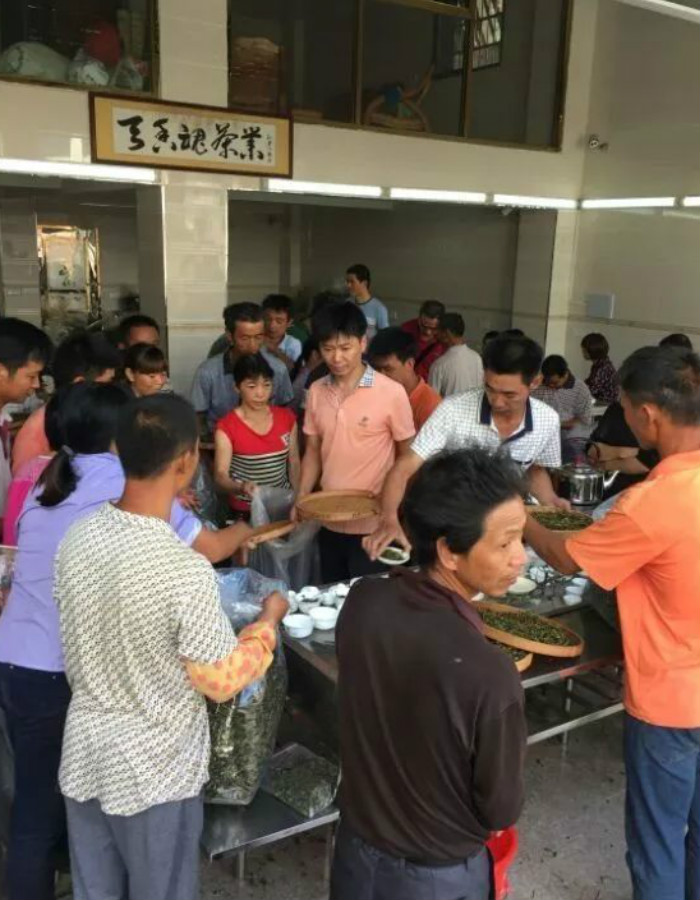 ▲ 当地最大的茶叶合作社——庆芸茶叶专业合作社茶农收购现场,茶农排起了多个长队。