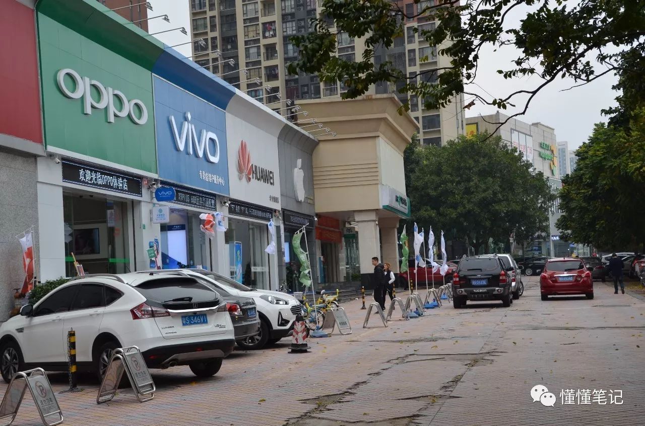 以齐齐哈尔为例,城中主要街区的手机店或连锁卖场都是以OV为主的蓝色和绿色,中间偶尔穿插金立和华为的金色和白色。懂懂笔记丈量了从卜奎南大街南马路至龙华路中间1.5公里左右的距离,发现马路两侧OPPO的独立门店超过3家,vivo也有2家,而手机连锁卖场主打OV品牌的不少于8家,如此密度意味着每走一百米你就会被OV品牌影响到一次。