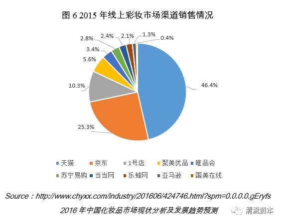 在线上渠道中,主流电商占据了销售份额的大头。天猫、京东、1号店位列前三。其中天猫京东占据7成份额,1号店在彩妆品类上增长迅速,从过去的6-7%增长到2015年的10.3%。