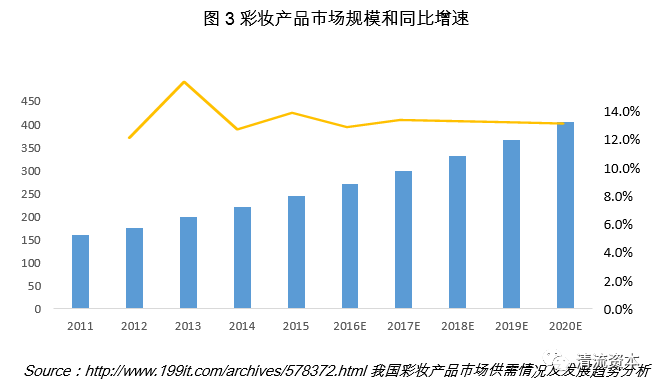 自2013年以来,中国彩妆市场稳定在化妆品市场份额的8%左右,2016年彩妆市场规模达到了278亿元。从2012-2015年11.44%的彩妆年复合增长率来看,未来5年彩妆市场将继续维持10.85%的增速,在2020年成长为420.16亿元的大蛋糕。