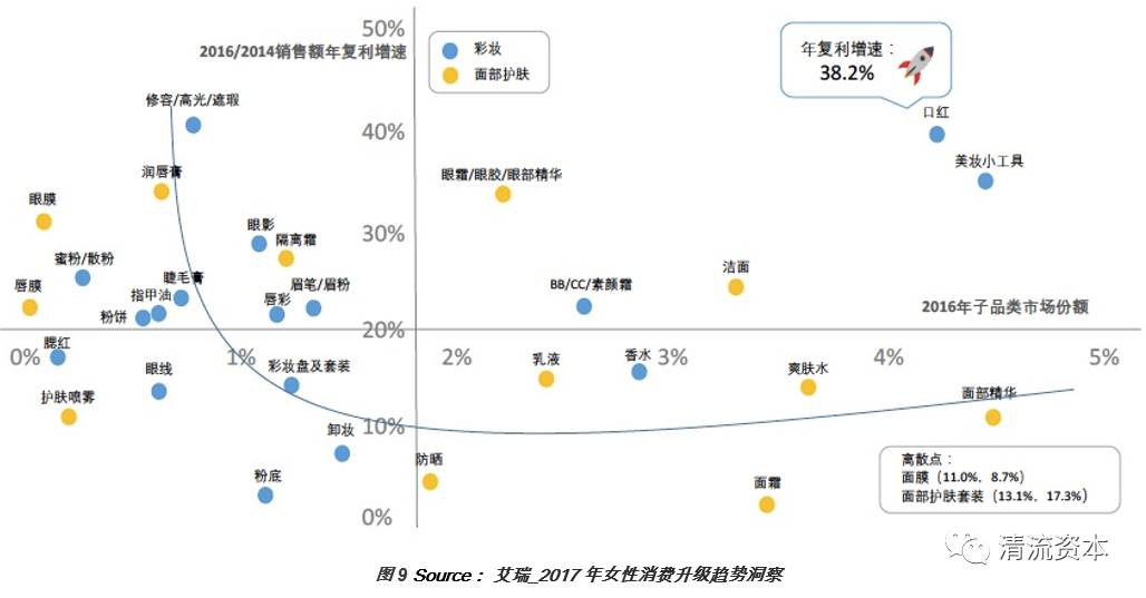如果要宏观地分析整个彩妆细分品类的特性光谱,可以参考图10。下面的矩阵基于销售额年复利增速(纵轴)和市场份额(横轴),将彩妆的细分品类分为四个象限。纵轴数值越大,品类的增速越快;横轴数值越大,市场份额越大。图中的下凹曲线的右边为彩妆子品类甜区,品类数量少,彩妆和护肤品进来的数量不相上下,口红就位于这个区域内。象限2的品类现有规模小但增长快,大多数彩妆子品类集中在这个区域;象限3的小品类增长速度慢;象限4的品类数量不多,但集中了许多护肤品品类。一个有意思的小规律是,彩妆品类整体上跑得快,体量小,我们不妨称之为老鼠品类;护肤品品类属于大象级别,体积庞大,但步伐缓慢。