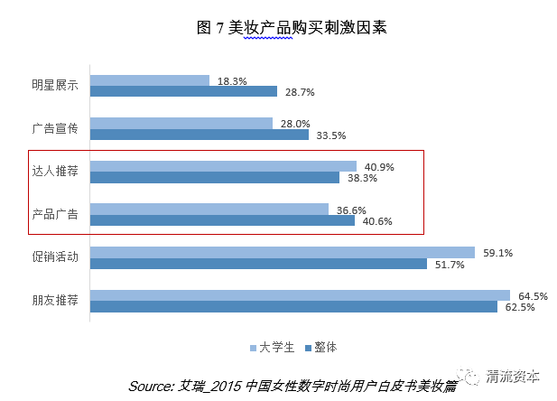 此外,品牌广告这种传统营销方式对年轻人的抓手越来越弱。和整个女性彩妆消费群体相比,大学生们更买账彩妆达人的教育营销。微博、微信公众号、时尚app的美妆博主们通过她们的试妆体验和彩妆教学分享刺激了小仙女们的购买欲。