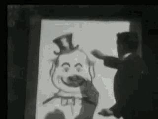 布莱克顿的创作手法,是他站在摄影机前面对观众,摆上一块画板,摄影机拍下他在画板上作画的过程。奇妙之处在于,他竟然能和画板上的脸互动,让画中人做出表情,从画里变出真的帽子——实际上,他的这种做法,也就是当今的定格动画。
