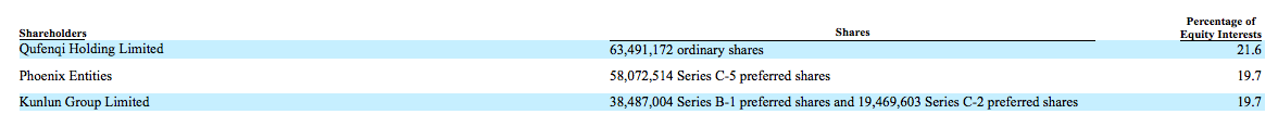 3年间,趣店飞速完成7轮融资,招股书显示:目前罗敏为最大股东,持股21.6%,Phoenix Entities(凤凰祥瑞)、Kunlun Group Limited(昆仑集团)并列为第二大股东,各自持股19.7%。