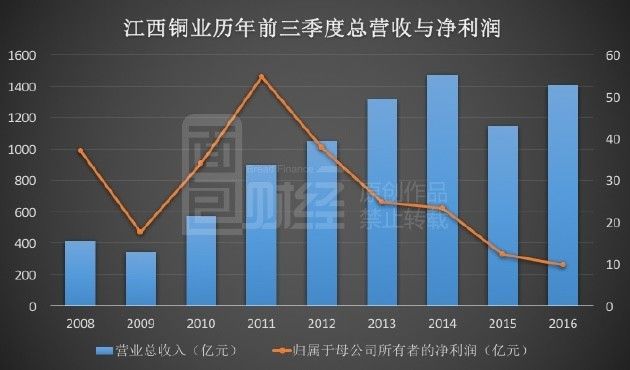 事实上,就在2016年前三季度,江西铜业业绩曾低的惊人。该年前三季度,其总营收高达1404.89亿,但净利润仅为9.88亿;其净利润创下自2005年同期以来的历史最低记录。下图为面包财经根据财报绘制的江西铜业历年前三季度总营收与净利润: