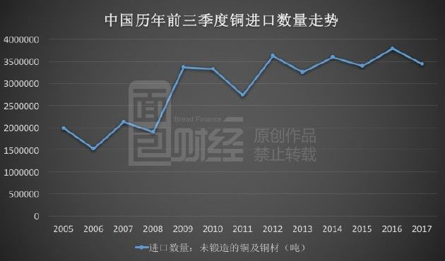 在铜价持续上涨,国内需求增加的背景下,铜进口量却并没有增加。据海关总署数据,截至今年9月底,中国进口的未锻造铜及铜材为344万吨,与去年同期相比,下降9.24%。下图为面包财经根据海关总署数据绘制的中国历年前三季度铜进口数量走势: