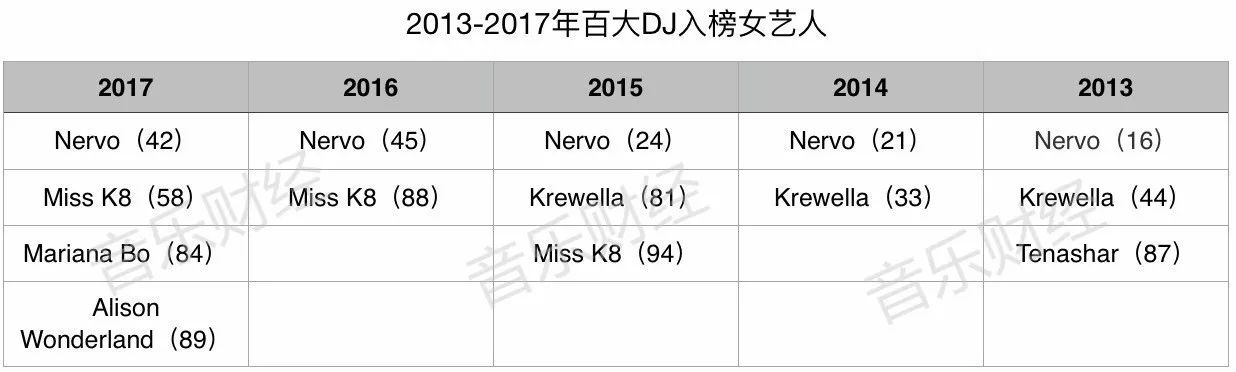 有不少媒体与爱好者也注意到,今年的百大榜单中有四位女艺人入榜,创下2013年到2017年这五年来的新高——是的,百大DJ榜单中女性入榜人数达到了4%,过去四年这个比例在2%-3%。
