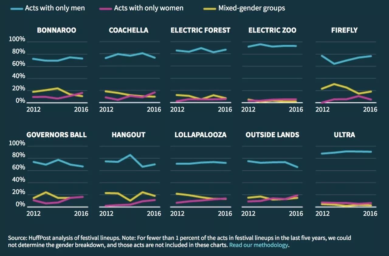 2016年,Coachella的阵容里一共有168名男性艺人,60名女性艺人——这是包括只有女性的演出者/组合以及男女混合组合的数字;Ultra的阵容里只有20名女艺人,为期两天的音乐节里,绝大多数在台上演出的是198名男性艺人;Lollapalooza的演出阵容中有124名男性,却只有47名女性。