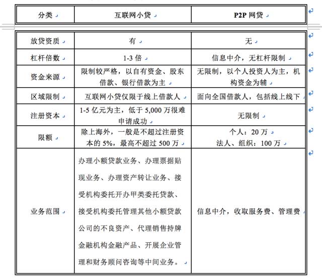 以下是互联网小贷与P2P网贷的对比: