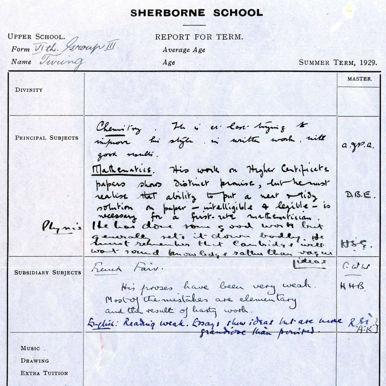当年的一份期末评价表显示,他的英文阅读薄弱,法语写作非常薄弱,文章比较浮夸。物理老师称他的“一部分作业还可以,但是通常写下来的都很差劲。” 这位物理老师强调:“他必须时刻记住,剑桥大学想看到的是扎实的知识基础,而不是一些模糊的概念。”