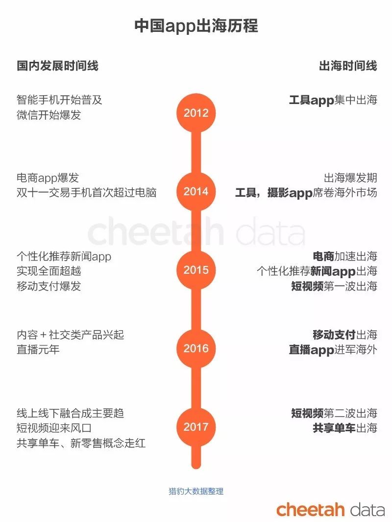 中国app的出海之路与中国移动应用市场的发展密不可分,随着第一批出海捞金的互联网公司成功获得用户与流量,将中国模式复制到海外的步伐越来越快,从工具出海、新闻出海,到直播短视频、共享单车的出海时间线就可见一斑。