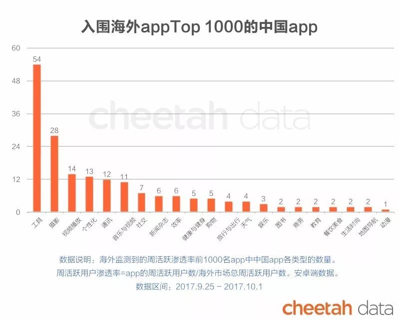 “猎豹大数据”显示,今年进入海外Top1000的中国app有185个,比2016年增加60多个(不包括游戏app)。与此同时,进入海外Top1000的中国app种类也在增多,与去年相比,新增了旅行与本地出行、教育、餐饮美食、生活时尚、地图和导航以及动漫6种类别,ofo、摩拜、腾讯动漫等都是今年新上榜的app。