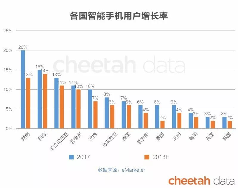 从上图列出的13个国家的智能手机用户增长率来看,目前,东南亚、印度、巴西以及俄罗斯市场由于智能手机用户增长更快,是中国app出海的重点目的地。