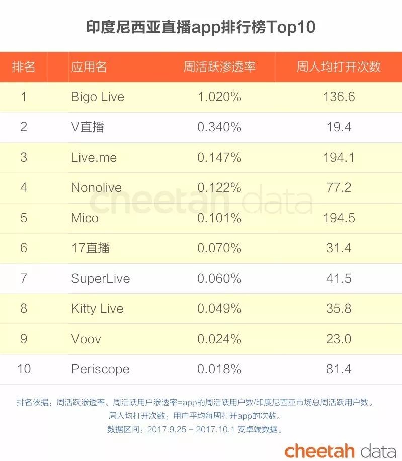从进入印尼直播app排行榜的中国app数量以及数据表现来看,印尼直播市场表现更为活跃。除了排在第一名的Bigo Live和第三名的Live.me,广州世讯信息的Nonolive,17直播,腾讯的VOOV等也都在榜上。