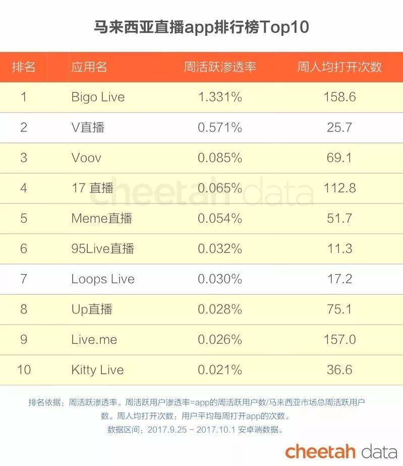 进入马来西亚直播app排行榜前十名的中国直播产品共有八款。除上文提到的几款产品,“海外版映客” Meme 直播,95Live,Up直播等也均有上榜。其中,排名第一的Bigo Live的周活跃渗透率领先第二名韩国Naver旗下的V直播两倍多,打开次数也高达150多次,占绝对优势。而第三名以下的应用从周活跃渗透率上与前两款应用相比都相差很多。