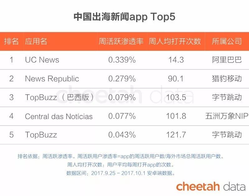 根据出海新闻app在海外的周活跃渗透率进行排名,前五名的公司名单与去年一致,其中阿里巴巴的“UC News”的增长较快,由第二名升至第一名。今日头条的海外版“TopBuzz”及“TopBuzz巴西版”都有上榜,并且打开次数较其他应用更占优势。