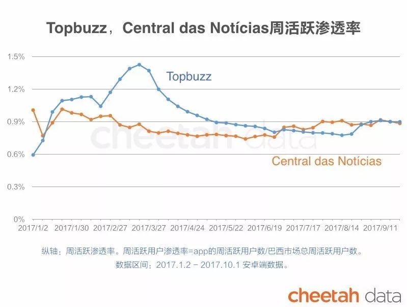 同为出海巴西的中国新闻聚合类app,Topbuzz和Central das Notícias的竞争可想而知,从两款app今年来在巴西市场的周活跃渗透率走势来看,Topbuzz的起伏更大,在三月份周活超过Central das Notícias50%多,但随后有所下降,现在两者数据差距不大。