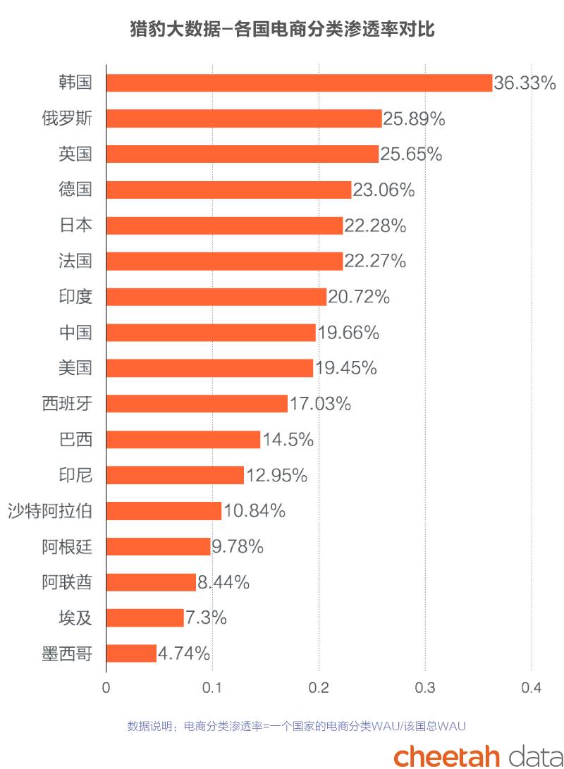 从“猎豹大数据”17个国家的电商分类渗透率(移动互联网用户中使用电商app的比例)可以看到,韩国的电商渗透率非常高,大比例超过其它国家,而中、美两个大国的电商app在移动用户中的渗透率低于印度和欧洲大部分国家,作为中、美、印度本土三股互联网力量交汇的热土,印度电商竞争非常激烈。而在排行榜末端的拉美、东南亚、中东国家,在移动电商领域的潜力可能更大。