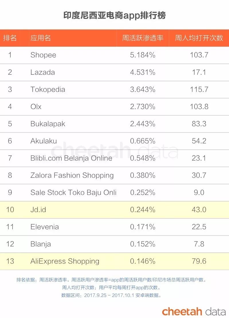 京东很早开始布局印尼市场,在当地建立仓储。在“猎豹大数据”的排行榜中,京东的印尼版本位列第10,而阿里速卖通(AliExpress)排名第13。从京东和AliExpress在印尼电商分类的渗透率来看,并不尽如人意,也解释了为什么它们都要选择收购或投资市场份额相对更大的Lazada和Tokopedia。