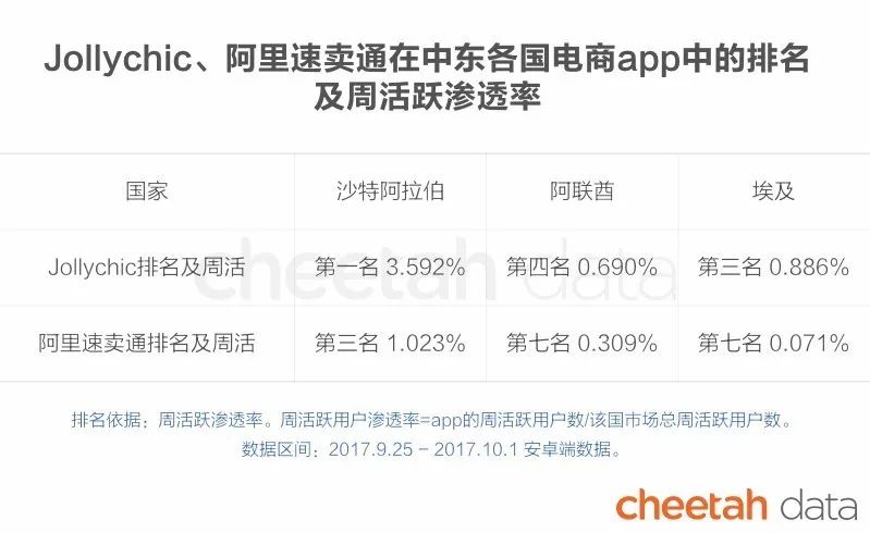 而从阿联酋、沙特阿拉伯、埃及这三个有代表性的市场数据来看,阿拉伯语地区整体的移动电商渗透率和用户粘性都比较低,虽然Souq规模很大,但是移动端的竞争,还是一个未知数,谁能拿下这个市场具备着无尽的可能性。在这种情况下,阿里速卖通和来自浙江的跨境电商Jollychic成为了亚马逊和souq在这个市场最大的中国对手。