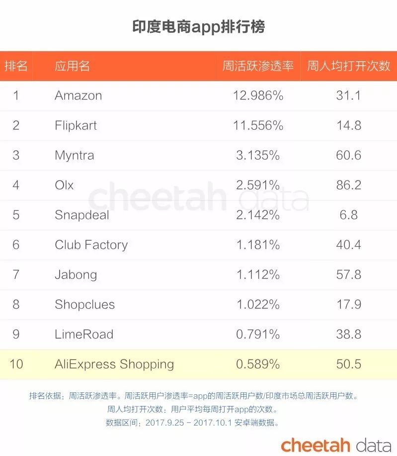 印度可以说是全球竞争最激烈的电商市场。已有网民用户中,印度的电商渗透率已经达到世界领先水准——电商app排名第一的亚马逊周活跃渗透率超过12%,意味着大约每8个印度移动互联网用户中,就有一个亚马逊的用户。