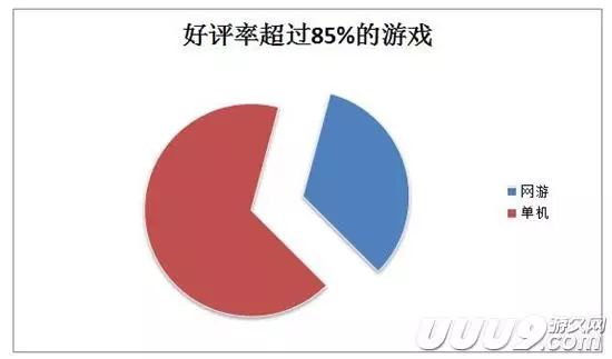 虽然从数量上看,腾讯的平台用户还是侧重网游,而从平台内的好评率上看,单机游戏整体表现不俗。全平台好评率超过85%的游戏共有21款(不包含非网游和单机类产品),在这21款游戏中,单机游戏占到了14个,是网络游戏的2倍。