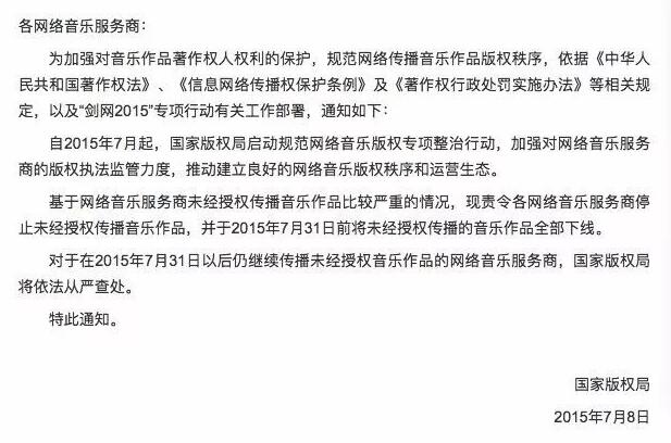 而在此之前,一度充斥着“拿来主义”的在线音乐市场随着2015年下发的“最严版权令”迈向了分水岭。2015年7月,国家版权局下发《关于责令网络音乐服务商停止未经授权传播音乐的通知》,中国音乐市场版权保护的“剑网行动”就此展开。