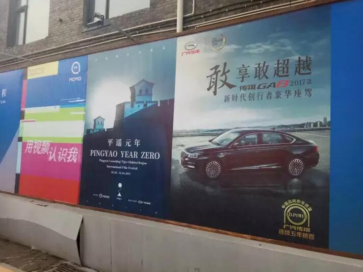 进入古城西门附近的平遥电影宫后,你会发现电影节战略合作伙伴广汽传祺,以及独家赞助方陌陌的海报宣传无处不在,其广告也出现在每场放映前的贴片中。此外服装品牌Bouthentique、平遥九瑞文化旅游发展公司、贾家庄旅游景区,以及贾樟柯自己的餐馆“山河故人家厨”等,都处在比较显眼的宣传位置。