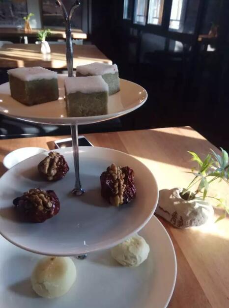 电影节的热度似乎并未烧到这里。我们成了那天下午山河故人唯一的客人,也没能撞见习惯在餐厅二楼写作的贾科长,只有墙上《山河故人》一幕幕镜头的定格瞬间。服务生用英式三层茶托盘端上来一份茶点,细看不仅莞尔:那么西式的装点,里面盛得却是山西特产红枣夹核桃。