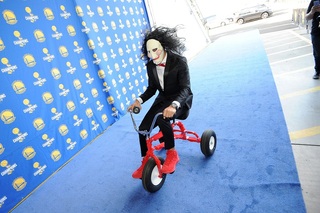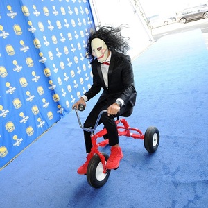 他头带《电锯惊魂》中杀手jigsaw的面具,并搭配假发,蹬着一辆红色三轮车进入场馆。进入场馆后,库里还碰到了格林,可惜的是这身装扮并没有吓到格林。