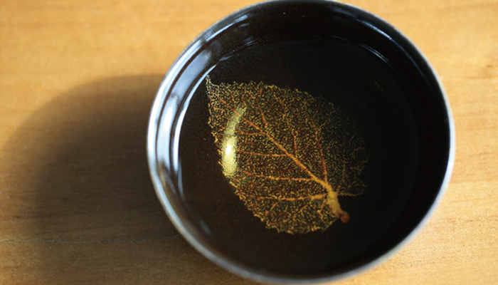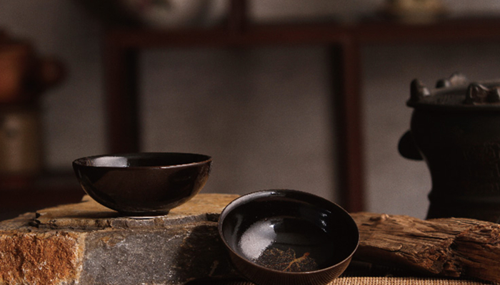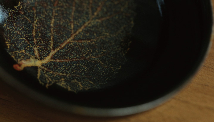 他制作木叶盏使用原产地吉安的天然泥为坯、古吉州窑原烧之地土釉原矿调制釉水,且承应古意,只选桑叶和菩提叶入盏,用清水洗净,稍作处理后置入釉坯中,一次性烧制而成。