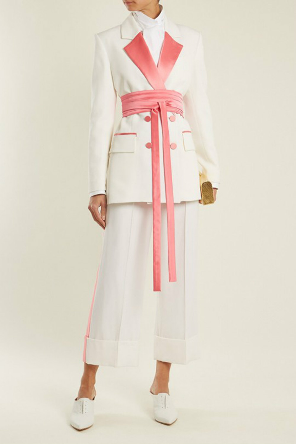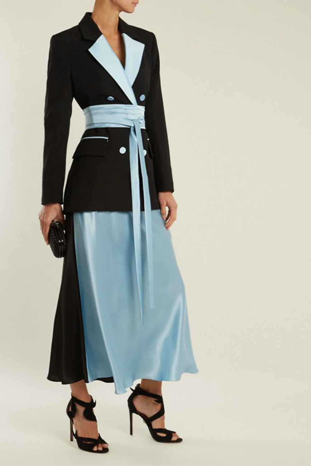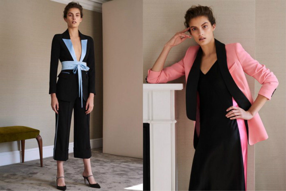 日出是鲜嫩的粉色和亮黄色,日落是成熟的深红,再加上一直做背景的蓝色天空,就组成了Racil女士吸烟装的全部配色灵感之源,这次不再是拘谨的黑白灰三色。来自英国伦敦的女装品牌Racil最近和电商网站MATCHESFASHION.COM合作,推出一个以日出和日落为主题的胶囊系列。这一系列裁剪利落的吸烟装采用了清丽的配色。为了凸显女性的柔美线条 ,还加入了真丝、天鹅绒等材料,用同种材质的宽腰封调和双排扣西服的正式感,西服外套搭配长裙的搭配方式很复古。