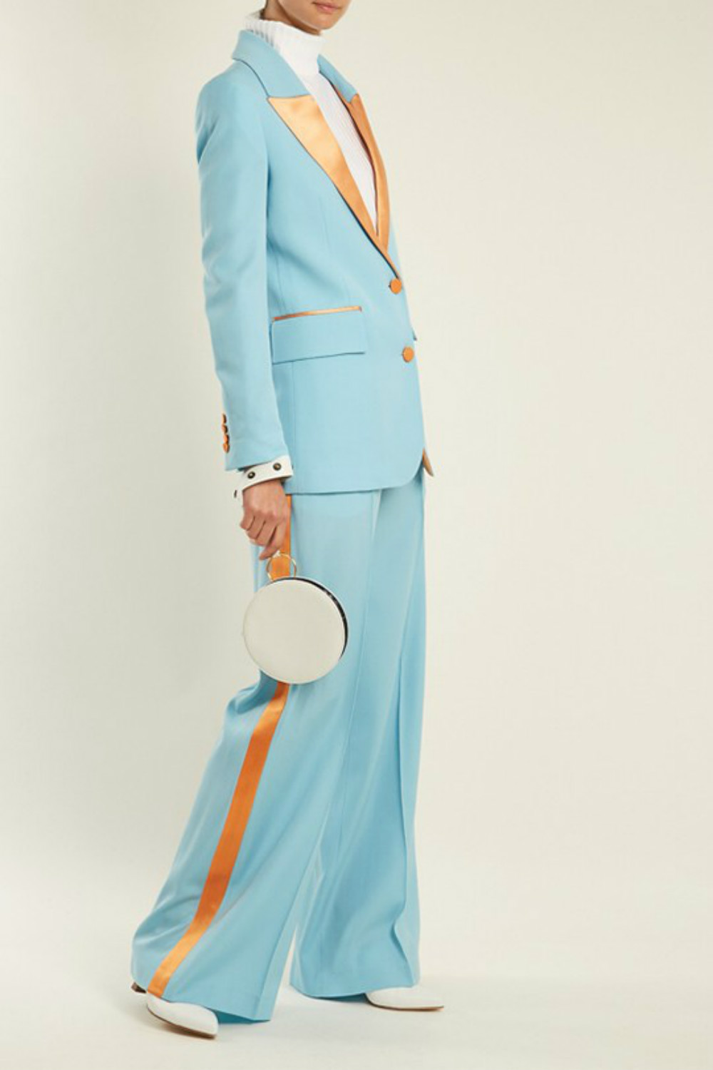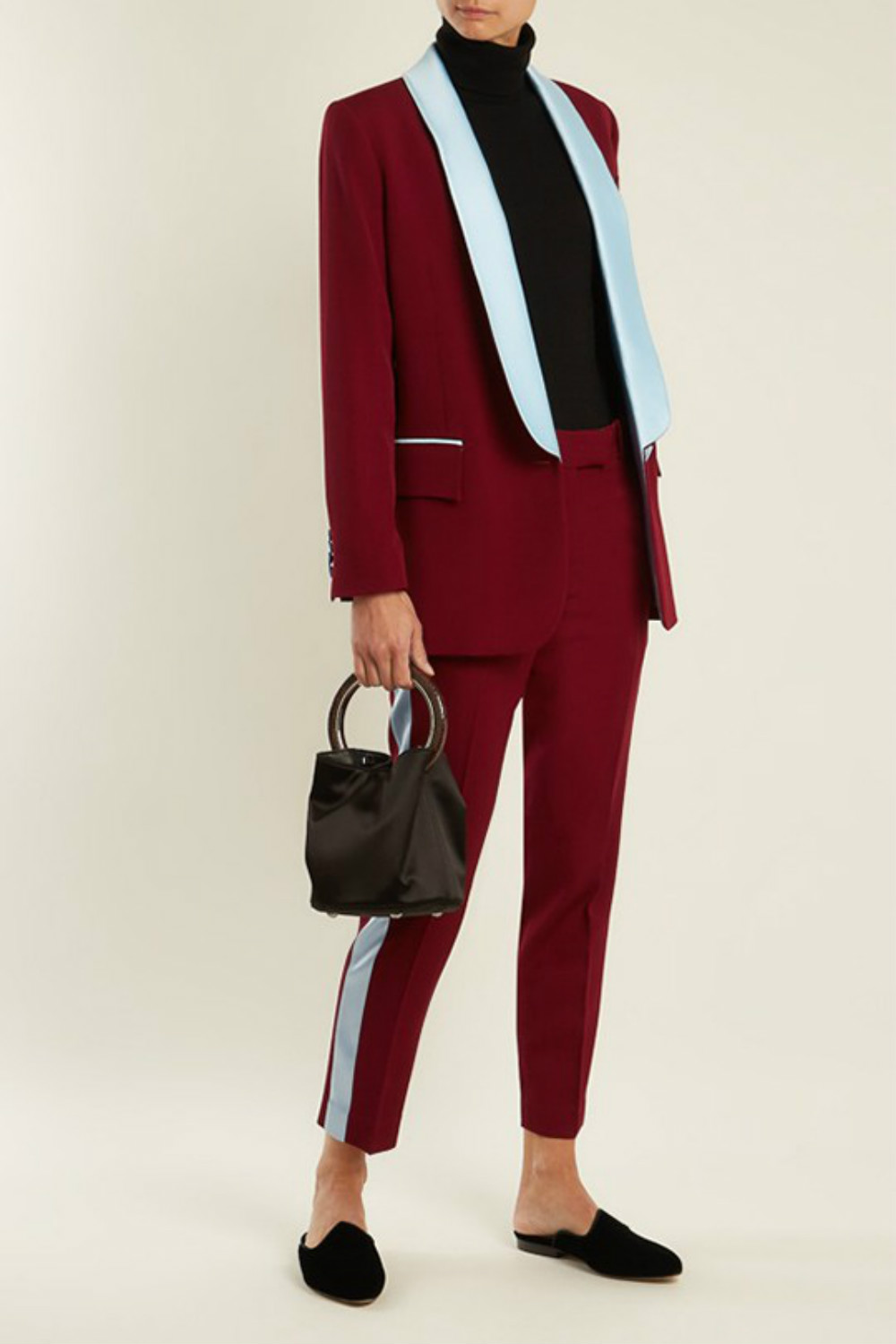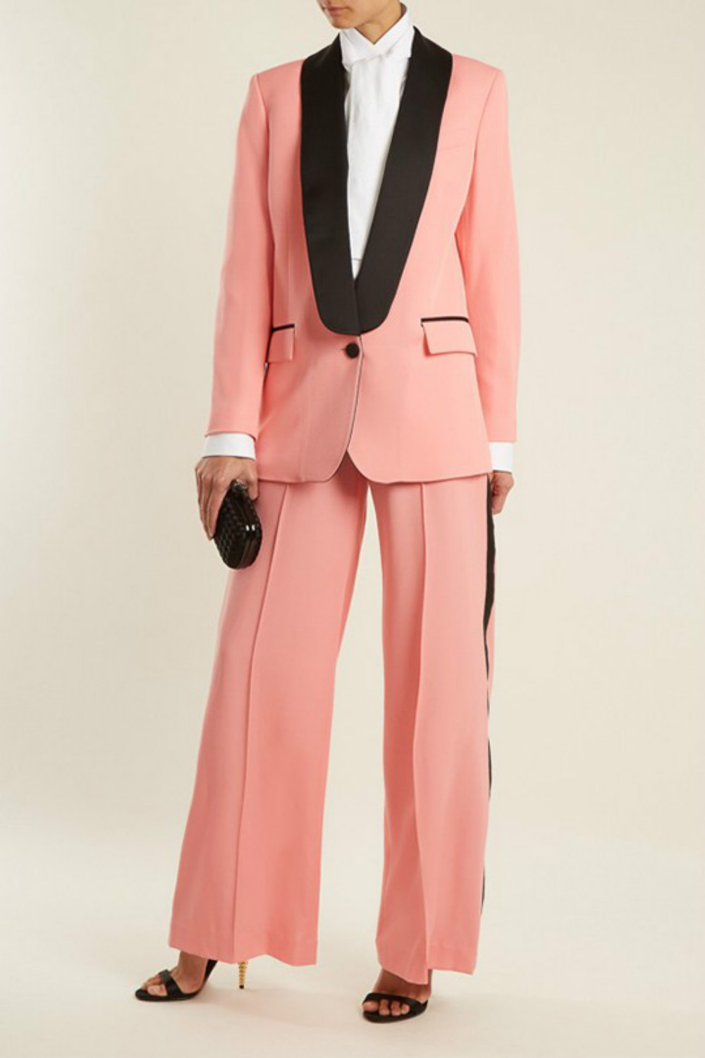 日出是鲜嫩的粉色和亮黄色,日落是成熟的深红,再加上一直做背景的蓝色天空,就组成了Racil女士吸烟装的全部配色灵感之源,这次不再是拘谨的黑白灰三色。来自英国伦敦的女装品牌Racil最近和电商网站MATCHESFASHION.COM合作,推出一个以日出和日落为主题的胶囊系列。这一系列裁剪利落的吸烟装采用了清丽的配色。为了凸显女性的柔美线条 ,还加入了真丝、天鹅绒等材料,用同种材质的宽腰封调和双排扣西服的正式感,西服外套搭配长裙的搭配方式很复古。