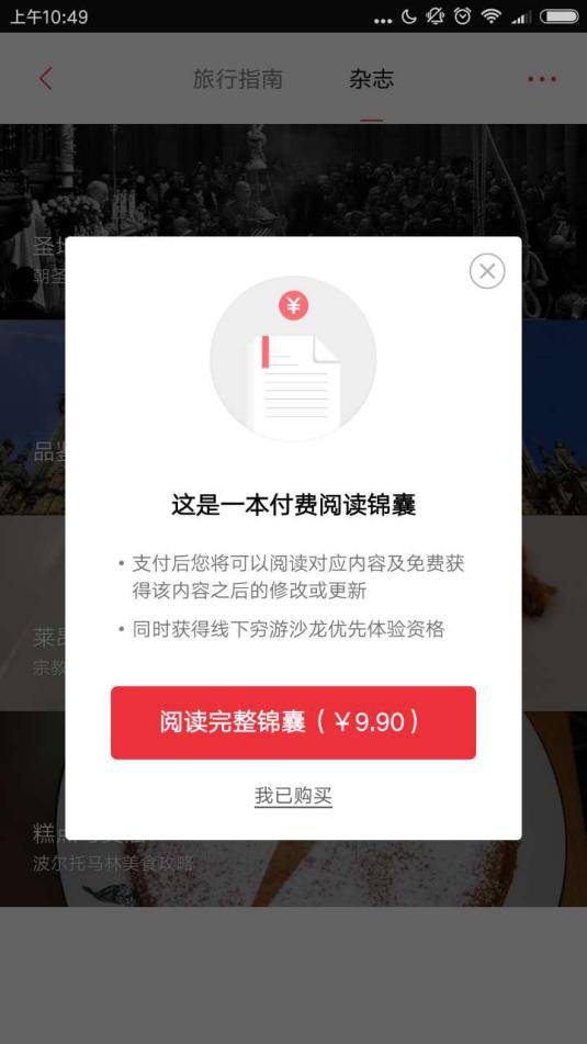 据执惠了解,目前穷游推出的付费内容主要是穷游锦囊中的部分目的地的攻略游记内容,包括整本的旅行指南和杂志,定价在3.9——15.9元之间,此外还有二十多篇单篇专题文章在做付费内容试水,每篇定价0.9元,在这些内容的底部有系统提示“付费阅读”,用户点击完成支付后,可以阅读完整旅游攻略内容。