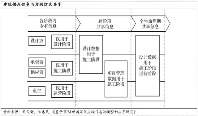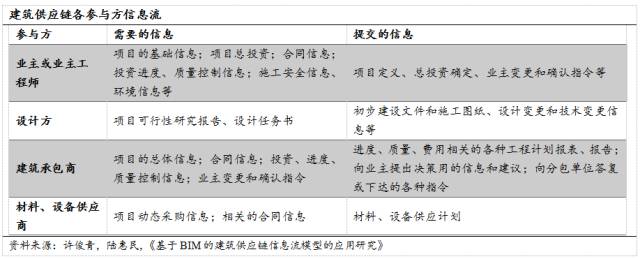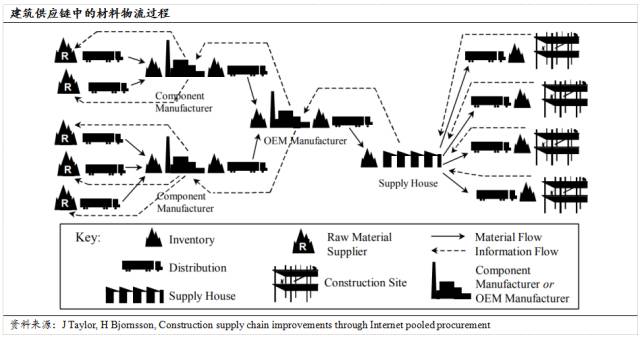 与传统制造业供应链相同,元立方研究员认为,建筑供应链亦主要包括物流、信息流及资金流三个方面内容。物流主要包括项目在建造过程中所需的各种建筑材料、设备及能源等。这些材料由外部输入,经过建造这项工作的转变,使建筑材料最后变成建筑产品。物流主要表现在物资的生产过程中。资金流指的是建设项目在建造过程中的价值转换。资金的流动是推进建设项目建造的主要动力,资金完成了从钱到物,再由物到钱的有效转变,推进项目进程。信息流是指建设项目在建造实施的过程中,项目全生命期上所有参与方之间产生的大量信息的流动。