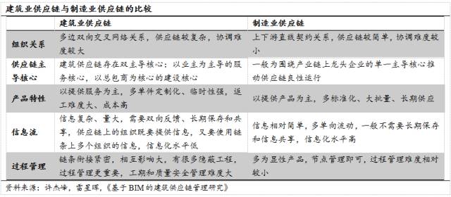 产品特性方面,建筑供应链以提供服务为主,多单件定制化、临时性强,返工难度大、成本高;而制造业以提供产品为主,多标准化、大批量、长期供应;